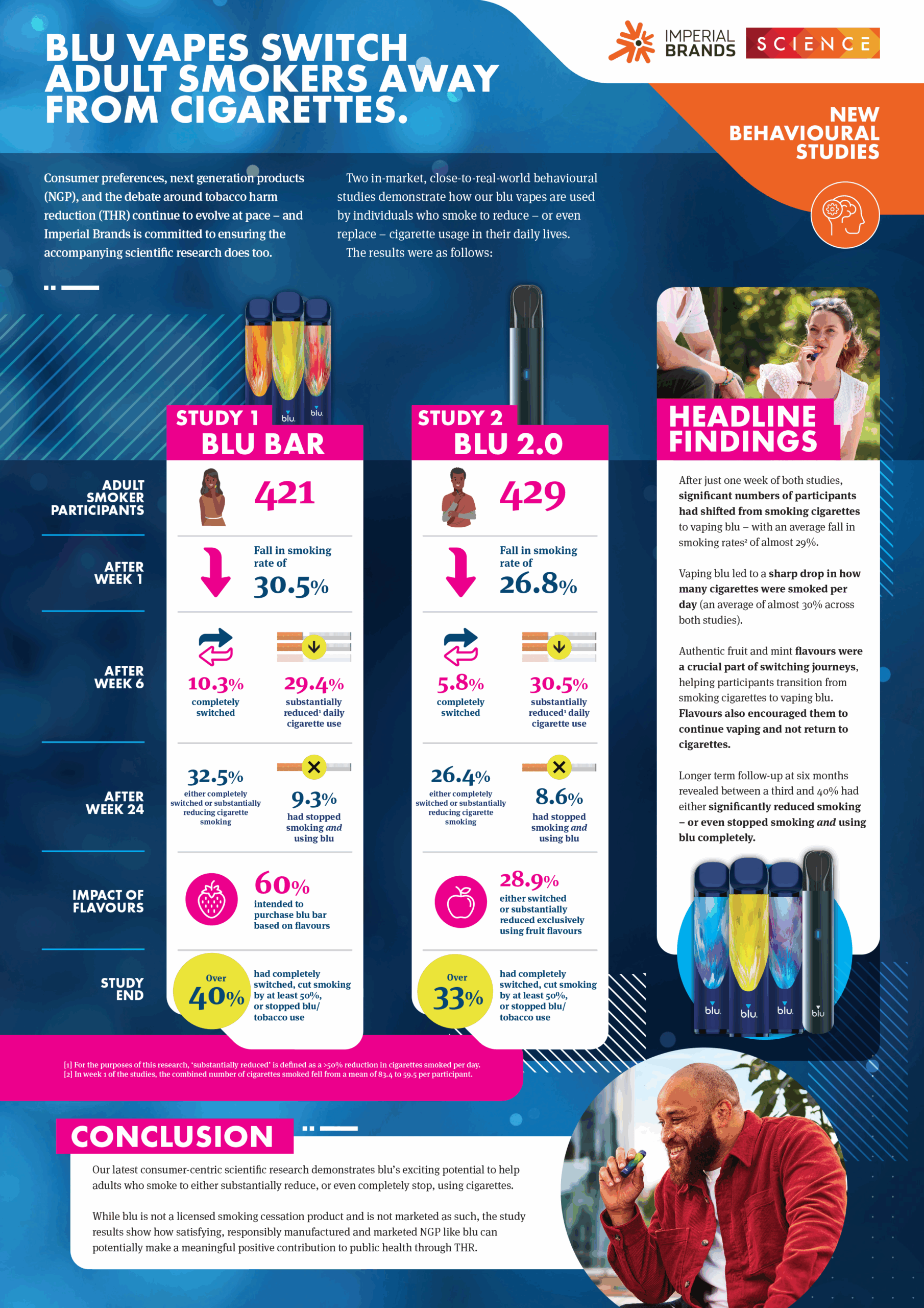 Following the encouraging results of our in-market PULZE & iD heated tobacco behavioural study last year, we recently conducted two new scientific studies focusing on our vaping product, blu.