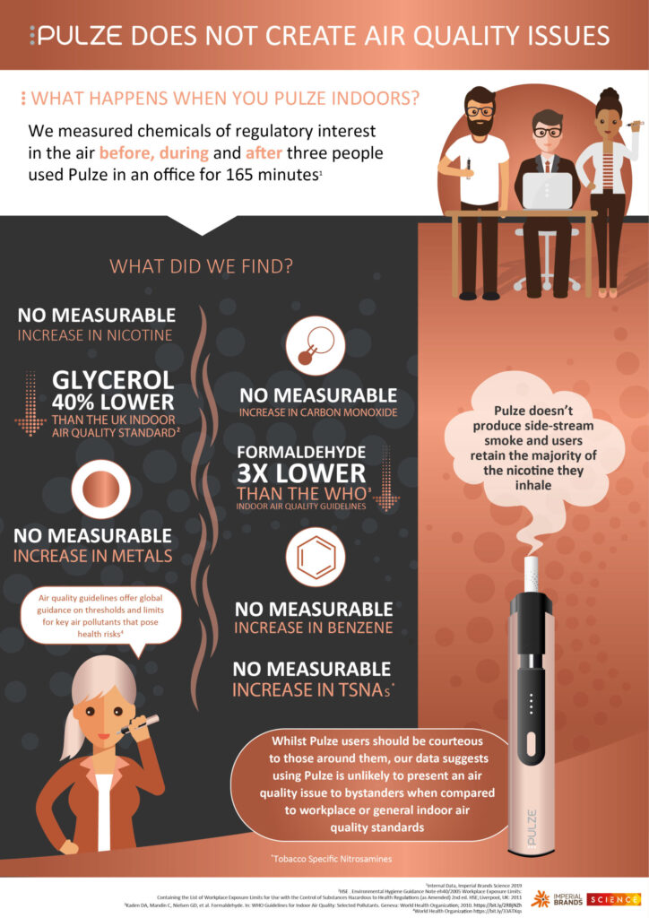 By Liz Mason, Heated Tobacco Science Manager Our infographic presents encouraging recent research conducted on behalf of Imperial Brands Science, and suggests using our Pulze heated tobacco device causes no noteworthy indoor air quality issues. This data add to our existing research demonstrating vaping doesn’t impact indoor air quality, or pose bystander health issues either. […]