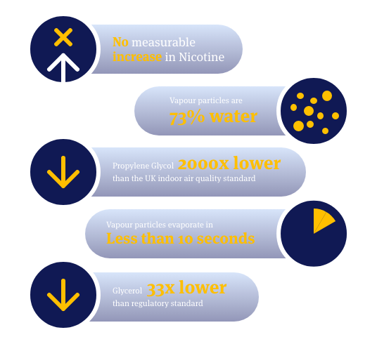 Exhaled blu aerosol evaporates in seconds, suggesting it creates no air quality issues to bystanders when compared to workplace or general indoor quality standards.